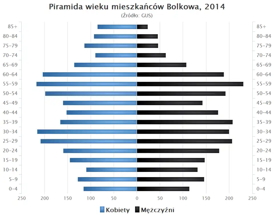 Piramida wieku mieszkańców Bolkowa w 2014 roku[22].