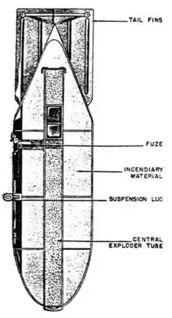 - bomby zapalające – służące do wywoływania pożarów, wypełnione środkami zapalającymi (głównie białym fosforem lub odmianami napalmu).