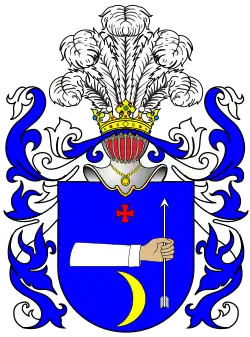 W polu błękitnym ręka w lewo w białym rękawie trzyma strzałę srebrną żeleźcem do góry, nad ręką krzyż kawalerski czerwony, a pod nią półksiężyc złoty rogami w prawo. W klejnocie nad hełmem w koronie pięć piór strusich.
