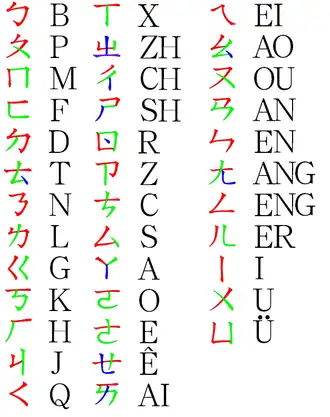 | ㄩ | ü, yu, iu | Z dawnego znaku 凵 qū, który stał się elementem niektórych znaków |