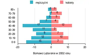 Współczesna struktura demograficzna wioski Borkowo Lęborskie na podstawie danych z lat 1995–2009 według roczników GUS-u, z prezentacją danych z 2002 roku[12]:
