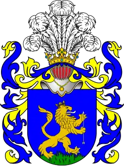 W polu błękitnym na murawie złoty lew wspięty w lewo, z takąż koroną na głowie, w prawej łapie trzyma strzałę żeleźcem w górę. W klejnocie nad hełmem w koronie pięć piór strusich.