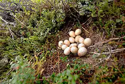 Wyprowadza 1 lęg[16]. Samce są poligamiczne. Samica sama buduje gniazdo z gałązek, trawy liści, mieści się ono w niewielkim zagłębieniu w ziemi pod pochylonym, martwym drzewem. Rozpoczyna lęgi pod koniec maja. Składa 5–8 jaj o wymiarach 44×32 mm. Inkubacja trwa 17–24 dni. Młode są opierzone po około 10 dniach.
