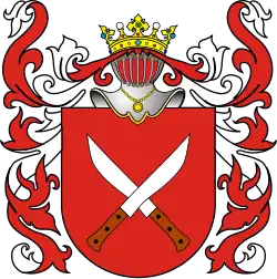 W polu czerwonym dwa skrzyżowane ukośnie noże rękojeściami w dół. Nad hełmem korona.