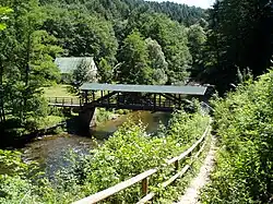 - Kładka dla pieszych „Boušínská lávka”[16] (zbudowana w 1876 r. przez właściciela nachodskich posiadłości ziemskich Wilhelma Augusta von Schaumburg-Lippe, 14 stycznia 1948 zniszczona przez powódź i w tym samym roku odbudowana, 1999 ze względu na zły stan techniczny została rozebrana, 29 kwietnia 2000 otwarta nowa kładka, 24 września 2002 zniszczona przez spadający gruby buk, na wiosnę 2003 nowo naprawiona, wiosną 2008 zniszczona przez orkan Emma[17], 21 marca 2008 została rozebrana[18], 20 listopada 2008 otwarta nowa kładka)[19]