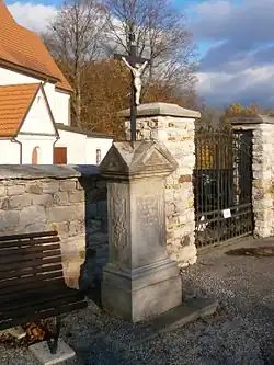 - Krzyż żelazny na kamiennym postumencie przy bramie cmentarza z 1898 r.
