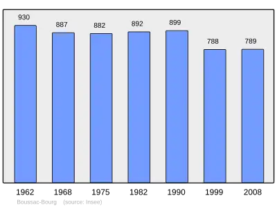 Według danych na rok 1990 gminę zamieszkiwało 899 osób, a gęstość zaludnienia wynosiła 23 osoby/km² (wśród 747 gmin Limousin Boussac-Bourg plasuje się na 145. miejscu pod względem liczby ludności, natomiast pod względem powierzchni na miejscu 85.).