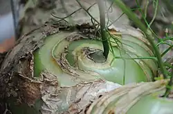 - Wklęsło-kuliste cebule o średnicy do 16 cm[6], wpierw podziemne, w miarę wzrostu wyrastające powyżej poziomu gruntu[11], części nadziemne są zielone, łuski zewnętrzne wpierw grube i mięsiste, następnie usychające i papierzaste. Cebule mają budowę sympodialną, a pąk wierzchołkowy, tworzący zarówno cebule potomne, jak i zawiązki pędów kwiatostanowych, znajduje się u nasady najbardziej wewnętrznego liścia spichrzowego. Na zewnętrznej powierzchni liści spichrzowych znajduje się niewiele aparatów szparkowych, a ich objętość tworzy wielkokomórkowa tkanka miękiszowa, magazynująca wodę[6].