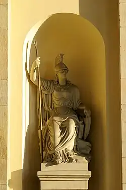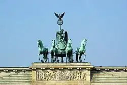 W 1793 ustawiono na bramie figurę kwadrygi powożonej przez uskrzydloną boginię Nike (ew. Wiktorię). Istnieje teoria, że kwadrygą powozi bogini pokoju Ejrene, lecz jest ona z wielu powodów mało prawdopodobna. Jednym z nich jest fakt, że Ejrene nigdy nie była przedstawiana ze skrzydłami. Są też inne dowody, jak choćby protokół między Langhansem i Schadowem z 13 marca 1789, które jednoznacznie wskazują na Wiktorię.