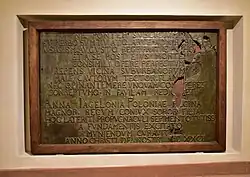 - Aby mostu stałego, zaczętego wspaniałym nakładem i cudną sztuką przez Zygmunta Augusta Króla Brata, a po Jego śmierci przez Nią podobną robotą dokończonego, nie ogarnął kiedyś nagły pożar od źle strzeżonych w sąsiedztwie domostw przedmieszczańskich i ogarnionego nie obrócił niespodziewanie w perzynę, Anna Jagiellonka, Królowa Polski, Wielkich Królów małżonka, siostra, córa, kazała obwarować to przedmurze najbezpieczniejszym ogrodzeniem ceglanym, wyprowadzonym od fundamentów Roku Chrystusa Boga naszego 1582.
