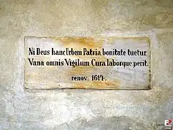 | Ni Deus hanc Urbem Patria bonitate tuetur Vana, omnis Vigilum Cura laborque perit. renov. 1614. |