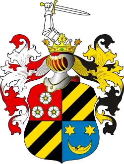 Na tarczy dzielonej w krzyż, w polu I, czerwonym, trzy róże srebrne (1 i 2), w polach II i III, czarnych, dwa skosy lewe złote, w polu IV, błękitnym, półksiężyc z twarzą złoty, na którego rogach po takiejż gwieździe.