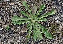 - Tworzą różyczkę liściową. Liście zatokowo ząbkowane lub wykrawane, lancetowate lub podługowate, pokryte białawymi, szorstkimi, dwudzielnymi włoskami[6].