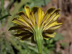 - Żółte, zebrane w zwisły za młodu koszyczek. Kwiaty brzeżne brunatno-stalowo-szare od spodu. Okrywa o długości 7-9 mm, z czarno obrzeżonymi listkami. Środkowe kwiaty i owoce z pierzastym, dwurzędowym puchem. Kwiaty i owoce brzeżne bez puchu, z krótkim, strzępiastym rąbkiem[6].