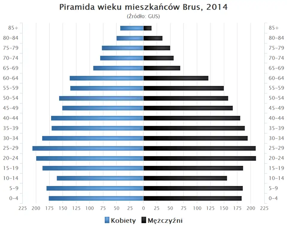 - Piramida wieku mieszkańców Brus w 2014 roku[9].