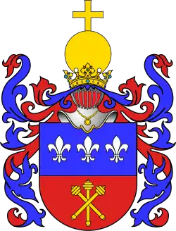 Na tarczy dzielonej w pas, w polu pierwszym, błękitnym, trzy lilie w pas, srebrne.