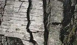 - Kora: Młode drzewa mają fioletowobrązową korę (ciemniejsza od kory brzozy żółtej), lecz z wiekiem staje się ona matowo ciemnoszara[4]. Na powierzchni liczne przetchlinki. Nie łuszczy się.