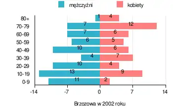 Współczesna struktura demograficzna wioski Brzozowa na podstawie danych z lat 1995-2009 według roczników GUS-u, z prezentacją danych z 2002 roku[6]: