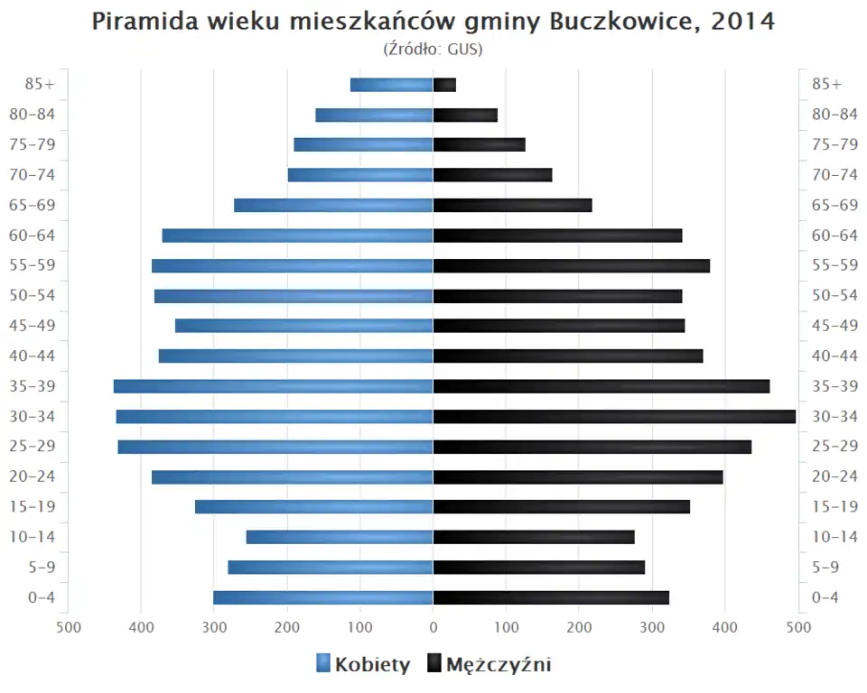 - Piramida wieku mieszkańców gminy Buczkowice w 2014 roku[1].