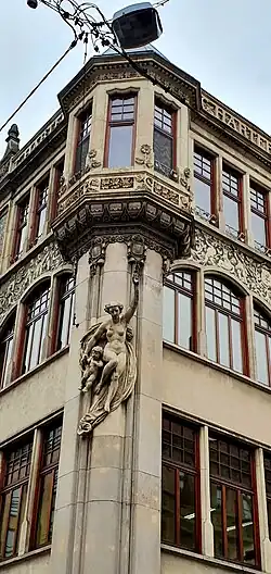 W elewacji północnej, w części dachowej, znajdują się dwa trójkątne szczyty będące reliktem pierwotnego projektu przed rozbudową; w elewacji wschodniej taki sam trójkątny szczyt znajduje się w środkowej osi elewacji[3]. Na dwóch pierwszych kondygnacjach powierzchnie ścian zajmują głównie trzyczęściowe okna. Na trzeciej kondygnacji trójdzielne okna wykończone są łukami, nad którymi w układzie dwupasmowym przedstawiono dwa cykle alegorycznych przedstawień, wplecionych w ornament roślinny z elementami secesji[3]. Podobne secesyjne płaskorzeźby znajdują się na narożnym wykuszu i na szczytach. W każdym polu umieszczono tarcze herbowe, na których symbolicznie przedstawiono sztuki wyzwolone. W partii szczytowej, na wspornikowych postumentach, pod baldachimami umieszczono figury dziecięce z atrybutami o symbolice kupieckiej, m.in. chłopiec w uskrzydlonym hełmie Hermesa, z kaduceuszem i z trzymaną w dłoni sakiewką[5].