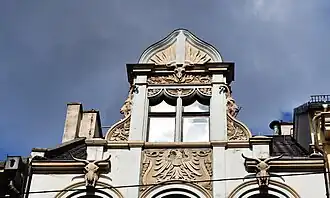 Fragment szczytu kamienicy nr 6 z bukranionami i pruskim orłem