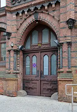 Architektonicznie gmach reprezentuje styl neogotycki[1]. Charakteryzuje się on bogatym wystrojem elewacji z cegły glazurowanej[13], w tym w formie zdobień nad bramą wjazdową[3].