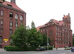 - 1 2 3 W źródłach można znaleźć sprzeczne informacje dotyczące liczby kondygnacji nadziemnych. Zarząd Geodezji, Kartografii i Katastru Miejskiego we Wrocławiu na swoim geoportalu udostępnia informację, iż jest to budynek o pięciu kondygnacjach[7]. Natomiast w udostępnianej przez Narodowy Instytut Dziedzictwa na portalu zabytek.pl w karcie ewidencyjnej zabytku nieruchomego (karta biała z 1.11.2011 r.) podawana jest informacja, że jest to budynek czterokondygnacyjny[15]. Domniemać można, że różnica ta wynika z faktu, iż z punktu widzenia wpisu do rejestru budynków, w budynku znajduje się piąta kondygnacja, którą jest częściowo nieużytkowane poddasze, widoczne także na załączonych do wyżej wymienionej karty ewidencyjnej rutach i przekrojach budynku oraz fotografiach dokumentacyjnych. Natomiast niezrozumiałe jest stwierdzenie o czterech kondygnacjach w karcie białej, gdyż część piątej kondygnacji jest użytkowana na potrzeby placówki oświatowej, m.in. sale gimnastyczne. Tak samo zresztą błędnie podano tam o ich położeniu na czwartej kondygnacji zamiast prawidłowo – na piątej kondygnacji. Może to sugerować mylenie pojęcia kondygnacji z potocznie używanym określeniem piętro i ich różnej numeracji. Ewentualnie może to być także zwykły błąd pisarski[7][45][72].
