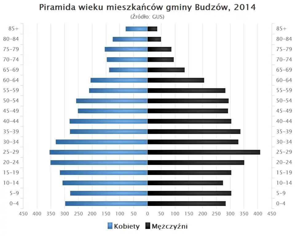 - Piramida wieku mieszkańców gminy Budzów w 2014 roku[3].