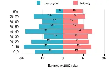 Współczesna struktura demograficzna wioski Bukowa na podstawie danych z lat 1995–2009 według roczników GUS-u, z prezentacją danych z 2002 roku[19]: