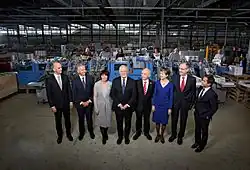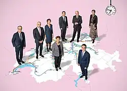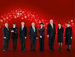 Szwajcarska Rada Związkowa w 2009 (I). Od lewej: Ueli Maurer , Micheline Calmy-Rey , Moritz Leuenberger , prezydent Hans-Rudolf Merz , wiceprezydent Doris Leuthard , Pascal Couchepin , Eveline Widmer-Schlumpf oraz dodatkowo kanclerz federalna Corina Casanova
