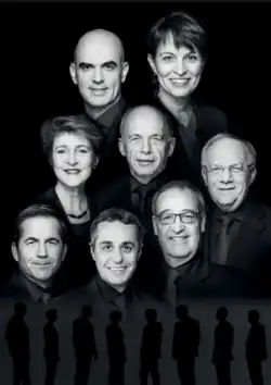 Szwajcarska Rada Związkowa w 2025 (II). Na pierwszym planie od lewej: Ignazio Cassis , prezydent Karin Keller-Sutter , wiceprezydent Guy Parmelin , Albert Rösti , Martin Pfister, Élisabeth Baume-Schneider , Beat Jans i kanclerz federalny Viktor Rossi