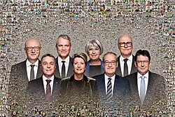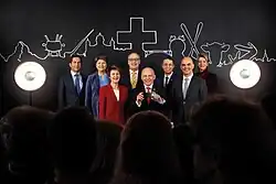 Szwajcarska Rada Związkowa w 2019. Od prawej: Karin Keller-Sutter , Alain Berset , Ignazio Cassis , prezydent Ueli Maurer , Guy Parmelin , wiceprezydent Simonetta Sommaruga , Viola Amherd oraz dodatkowo kanclerz federalny Walter Thurnherr
