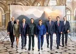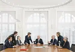 Szwajcarska Rada Związkowa w 2017 (I). Od prawej: prezydent Doris Leuthard , wiceprezydent Alain Berset , Didier Burkhalter , Ueli Maurer , Simonetta Sommaruga , Johann Schneider-Ammann , Guy Parmelin oraz dodatkowo kanclerz federalny Walter Thurnherr