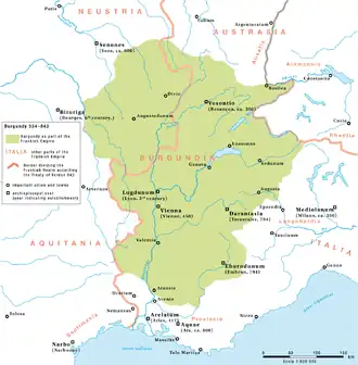Resztki ludu po klęsce w walce z Hunami znalazły nowe ziemie na południu Galii: według anonimowego autora Chronica Gallica z 452 roku „Sapaudia jest podarowana tym Burgundom co pozostali (od 25 000 do 50 000 według specjalistów tematu), do podziału z miejscowymi” w 443 roku przez wodza Aecjusza Flawiusza, w roli obrońców przed Alamanami i Wizygotami. Chodzi o tereny dzisiejszej zachodniej części Szwajcarii, Sabaudii i Jury, czyli dorzecze Rodanu, ze stolicą w Genewie. Ziemie te nazwano później Burgundią. Dzięki inteligentnej polityce kompromisu i tolerancji królowie burgundzcy poszerzyli ich terytorium (do Avignonu na południe, Nevers na zachodzie i jeziora Bodeńskiego na wschodzie) i doprowadzili do symbiozy i połączenia elementów tubylczych z przybyszami, stwarzając nowe społeczeństwo o specyficznej tożsamości.