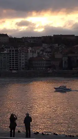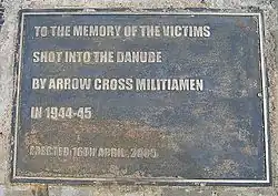 - Kompozycja nazwana „Butami na brzegu Dunaju”, (A Cipők a Duna-parton)" stanowi pamiątkę po ludziach rozstrzelanych nad brzegiem Dunaju w czasie terroru strzałokrzyżowców. Artysta rzeźbiarz wykonał z żeliwa sześćdziesiąt par butów z tamtego okresu. Za płytą z naturalnego kamienia obramowującą nabrzeże, do której przymocowano buty, ciągnie się długa na 40 metrów i wysoka na 70 cm kamienna płyta. W trzech miejscach pomnika można przeczytać umieszczony na żeliwnych tablicach napis po węgiersku, angielsku i hebrajsku: "„Pamięci budapeszteńskich ofiar rozstrzelanych nad brzegiem Dunaju przez uzbrojonych strzałokrzyżowców odsłonięto 16 kwietnia 2005". Źródło: MTI 16 kwietnia 2005.