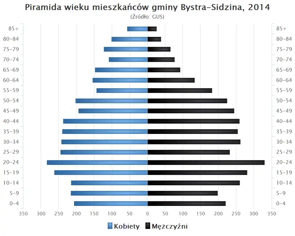 - Piramida wieku mieszkańców gminy Bystra-Sidzina w 2014 roku[11].