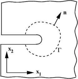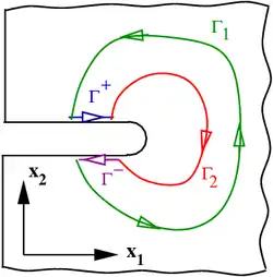 gdzie oznacza składową całki J dla otwartej szczeliny w kierunku a jest małym obszarem wokół czoła szczeliny.