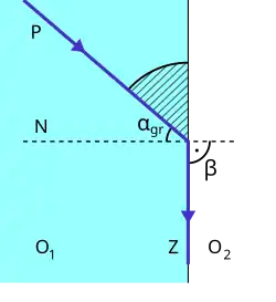 Światło padające na granicę ośrodków i pod kątem mniejszym od granicznego zostaje częściowo odbite, a częściowo przechodzi do drugiego ośrodka (jest załamane). Jeżeli to współczynnik załamania ośrodka a współczynnik załamania ośrodka i wtedy kąt padania jest mniejszy niż kąt załamania Przy pewnym kącie padania zwanym kątem granicznym, kąt załamania jest równy 90º. Dla kątów padania większych niż (zakreskowany zakres kątów na ilustracji) światło przestaje przechodzić przez granicę ośrodków i ulega całkowitemu odbiciu wewnętrznemu.