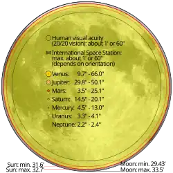 | średnica kątowa[9] | 33' 30" (0.5583°) | 29' 26" (0.4905°) |