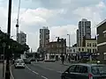 Od lewej: Camberwell College of Arts, park Camberwell Green, poprzednia siedziba lokalnej biblioteki, budynek byłej stacji Camberwell, widok na Camberwell Road.