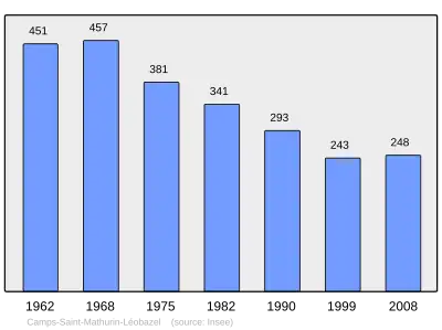 Według danych na rok 1990 gminę zamieszkiwały 293 osoby, a gęstość zaludnienia wynosiła 9 osób/km² (wśród 747 gmin Limousin Camps-Saint-Mathurin-Léobazel plasuje się na 360. miejscu pod względem liczby ludności, natomiast pod względem powierzchni na miejscu 143.).