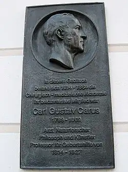 - 1 2 3 niem. Königlich Sächsische Chirurgisch-Medicinische Akademie; Szkoła Medycyny i Chirurgii została przekształcona w Wydział Medyczny Uniwersytetu Technicznego w Dreźnie. Carus był współzałożycielem tego Wydziału i pracował w nim do śmierci (obecna nazwa: Universitätsklinikum Carl Gustav Carus Dresden w Medizinische Akademie „Carl Gustav Carus“).