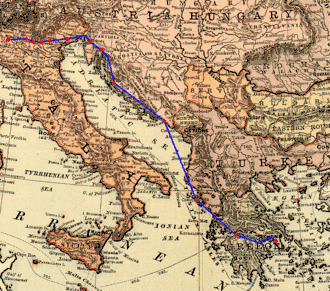 Podróż rozpoczął 28 lutego, ale napotkał na problemy w Dubrowniku, ponieważ położona w pobliżu granica z Turcją była zamknięta. Airoldi wygrał jednak odbywający się w tym czasie bieg wokół murów miejskich i za zdobyte w ten sposób pieniądze kupił bilet na statek. Do Aten dotarł 2 kwietnia. Ponieważ był pierwszym Włochem, który przybył do Grecji, został przyjaźnie przyjęty. Jego obecność pozwalała zaliczyć Włochy w poczet krajów biorących udział w igrzyskach, a na tym Grekom bardzo zależało[1].