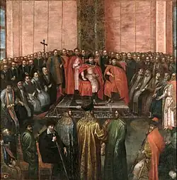 Stanisław Żółkiewski, po spektakularnym rozbiciu w lipcu 1610 wielkiej armii Dymitra Szujskiego w bitwie pod Kłuszynem, został zaproszony na Kreml przez bojarów, którzy skłonni byli oddać tron carski Władysławowi, synowi Zygmunta. W sali tronowej otoczony przez senatorów zasiadł na tronie król Zygmunt, u jego boku królowa z dziećmi i świtą. Car Wasyl przeszedł przez całą salę i przed tronem, zdejmując futrzany czap z głowy, złożył polskiemu monarchie głęboki ukłon. Carscy bracia padli na kolana, uderzając głowami o podłogę i płacząc[8].