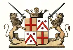 Na tarczy czterodzielnej, w polu I i IV złotych – krzyż czerwony; w II i III srebrnych – krokiew czerwona między trzema różami. Nad tarczą tylko korona szlachecka; tarczę podtrzymują dwa lwy złote z mieczami.
