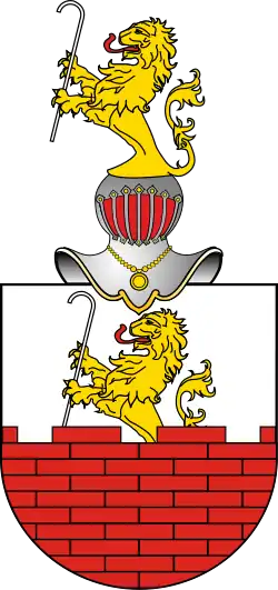 W polu srebrnym, lew złoty, wyskakujący zza muru czerwonego, trzymający laskę.