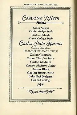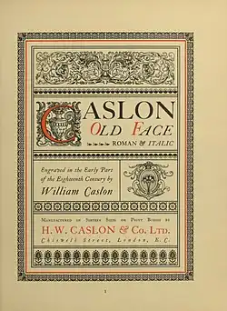 - ↑ Specimens of Type. London: H.W. Caslon & Co. 1915.