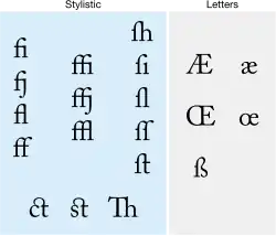 Ważną cechą tego wznowienia Caslona jest jego szerokie „T”, które może dość nieporadnie łączyć się z glifem „h”. W związku z tym wśród wydawnictw cyfrowych standardem stało się oferowanie inspirowanej tradycyjną kaligrafią ligatury „Th” w celu osiągnięcia bardziej zwartego zapisu tych znaków[79]. Adobe Caslon, LTC Caslon, Williams Caslon Text i Big Caslon (tylko kursywa w wydaniu Font Bureau) – wszystkie te kroje zawierają ligaturę „Th” jako domyślną lub alternatywną dla danego kroju pisma.