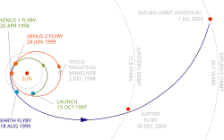 W drodze do Saturna sonda dwukrotnie przeleciała obok Wenus, minęła Ziemię oraz Jowisza. Po zakończeniu w połowie 2008 roku głównej misji w układzie Saturna, została ona kolejno dwukrotnie przedłużona. Sonda Cassini uległa zniszczeniu 15 września 2017 roku w atmosferze Saturna.