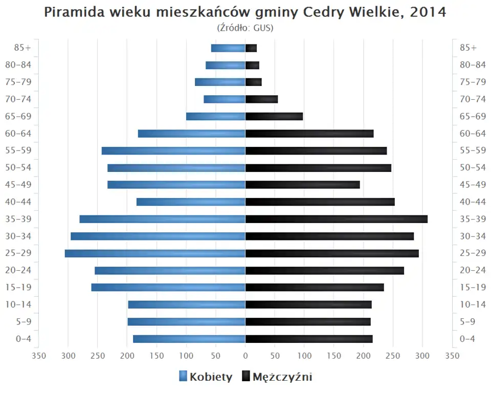 - Piramida wieku mieszkańców gminy Cedry Wielkie w 2014[5].